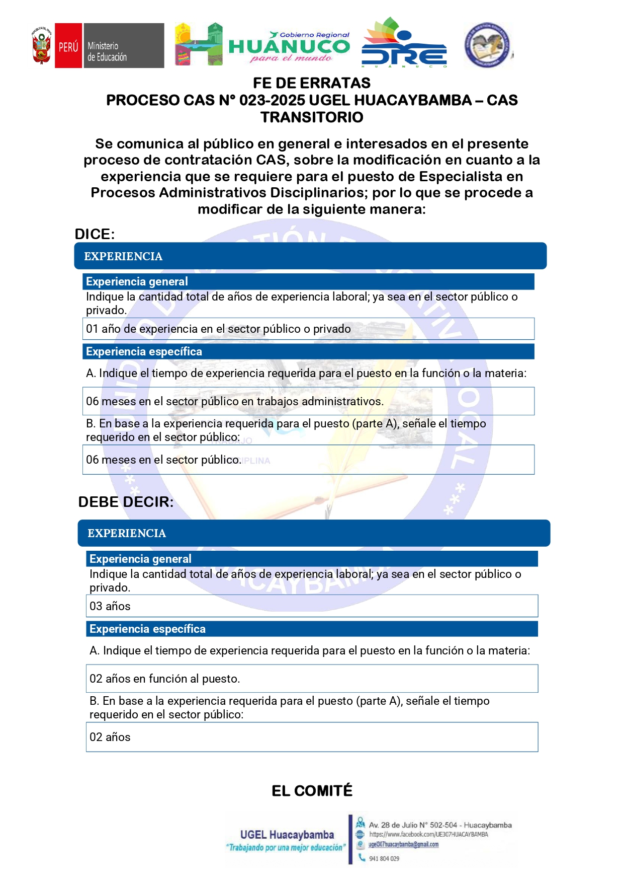 Concurso público CAS - UGEL HUACAYBAMBA para contratar: ESPECIALISTA EN PROCESOS ADMINISTRATIVOS DISCIPLINARIOS