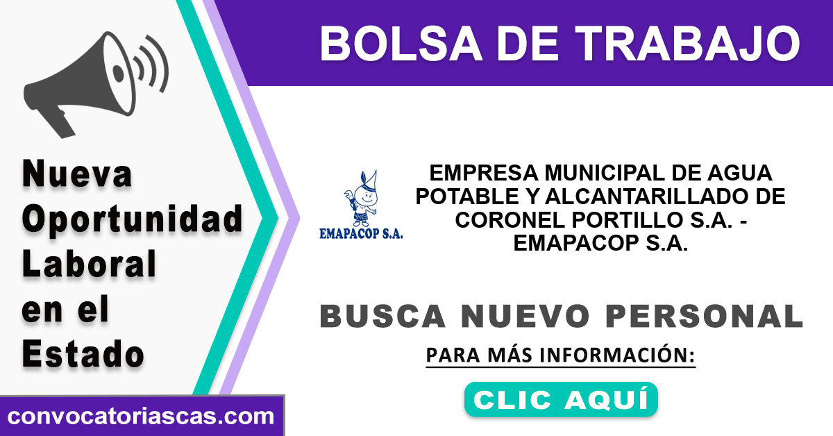 En esta página web difundiremos los procesos de selección de personal bajo la modalidad de Contratación Administrativa de Servicios(CAS) temporal o por suplencia llamados a concurso público por: "EMPRESA MUNICIPAL DE AGUA POTABLE Y ALCANTARILLADO DE CORONEL PORTILLO S.A. - EMAPACOP S.A.".