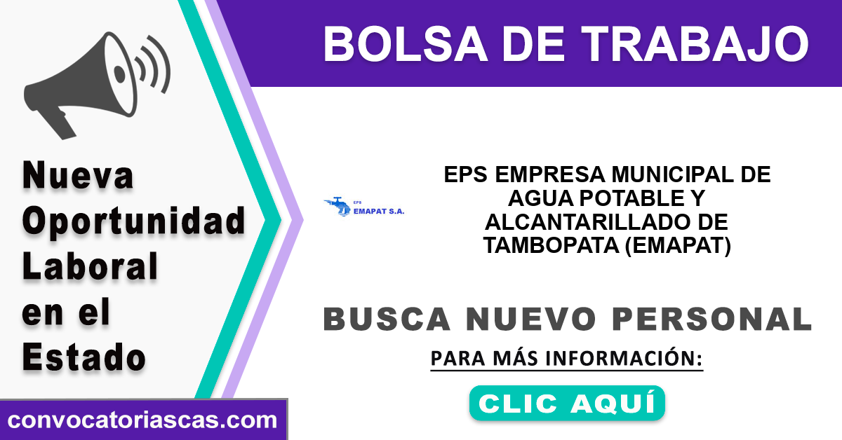En esta página web difundiremos los procesos de selección de personal bajo la modalidad de Contratación Administrativa de Servicios(CAS) temporal o por suplencia llamados a concurso público por: "EPS EMPRESA MUNICIPAL DE AGUA POTABLE Y ALCANTARILLADO DE TAMBOPATA (EMAPAT)".