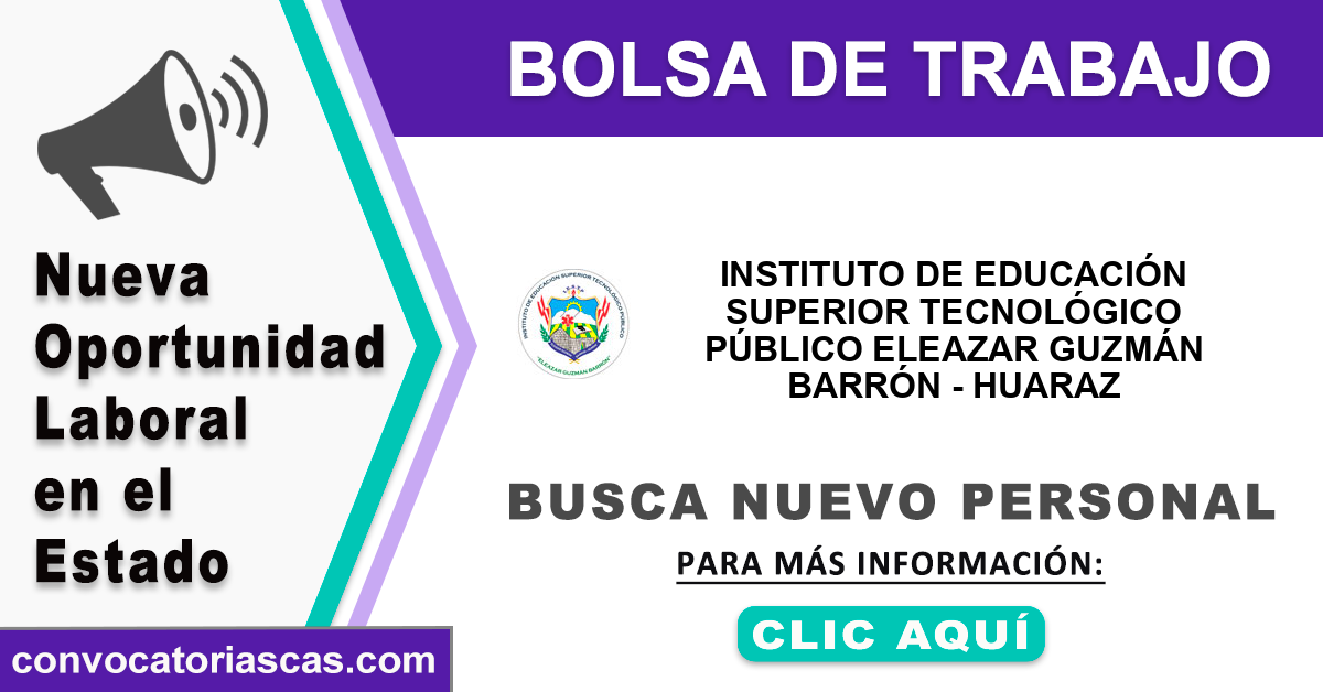 En esta página web difundiremos los procesos de selección de personal bajo la modalidad de Contratación Administrativa de Servicios(CAS) temporal o por suplencia llamados a concurso público por: "INSTITUTO DE EDUCACIÓN SUPERIOR TECNOLÓGICO PÚBLICO ELEAZAR GUZMÁN BARRÓN - HUARAZ".