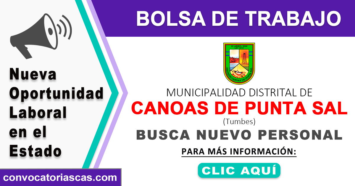 En esta página web difundiremos los procesos de selección de personal bajo la modalidad de Contratación Administrativa de Servicios(CAS) temporal o por suplencia llamados a concurso público por: "MUNICIPALIDAD DISTRITAL DE CANOAS DE PUNTA SAL".
