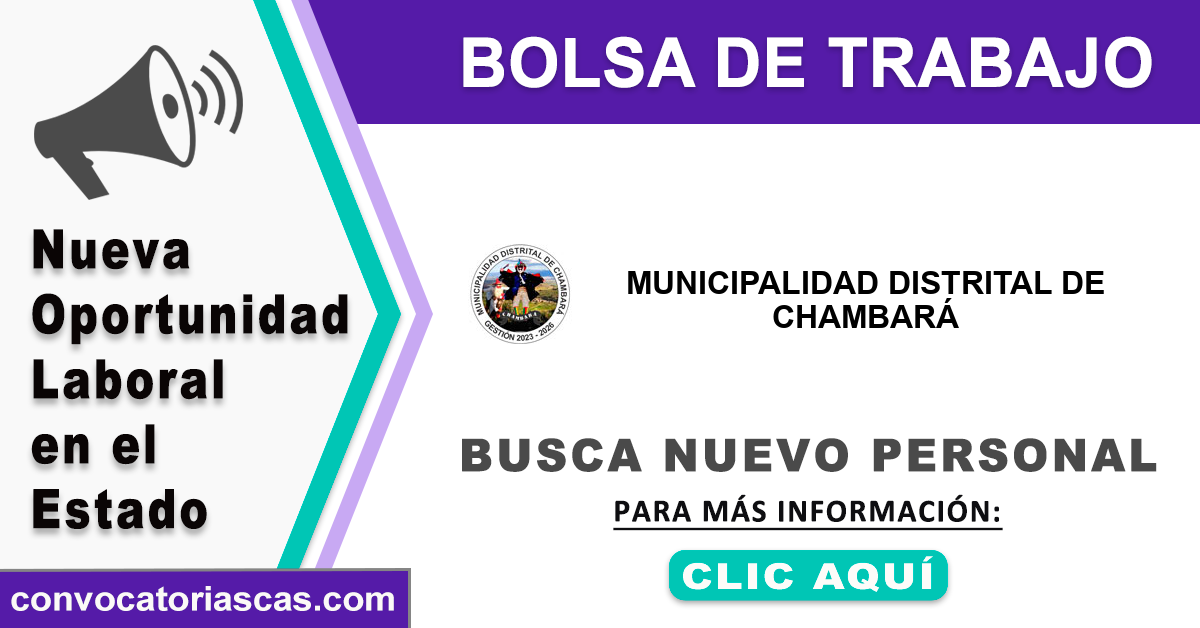 En esta página web difundiremos los procesos de selección de personal bajo la modalidad de Contratación Administrativa de Servicios(CAS) temporal o por suplencia llamados a concurso público por: "MUNICIPALIDAD DISTRITAL DE CHAMBARÁ".
