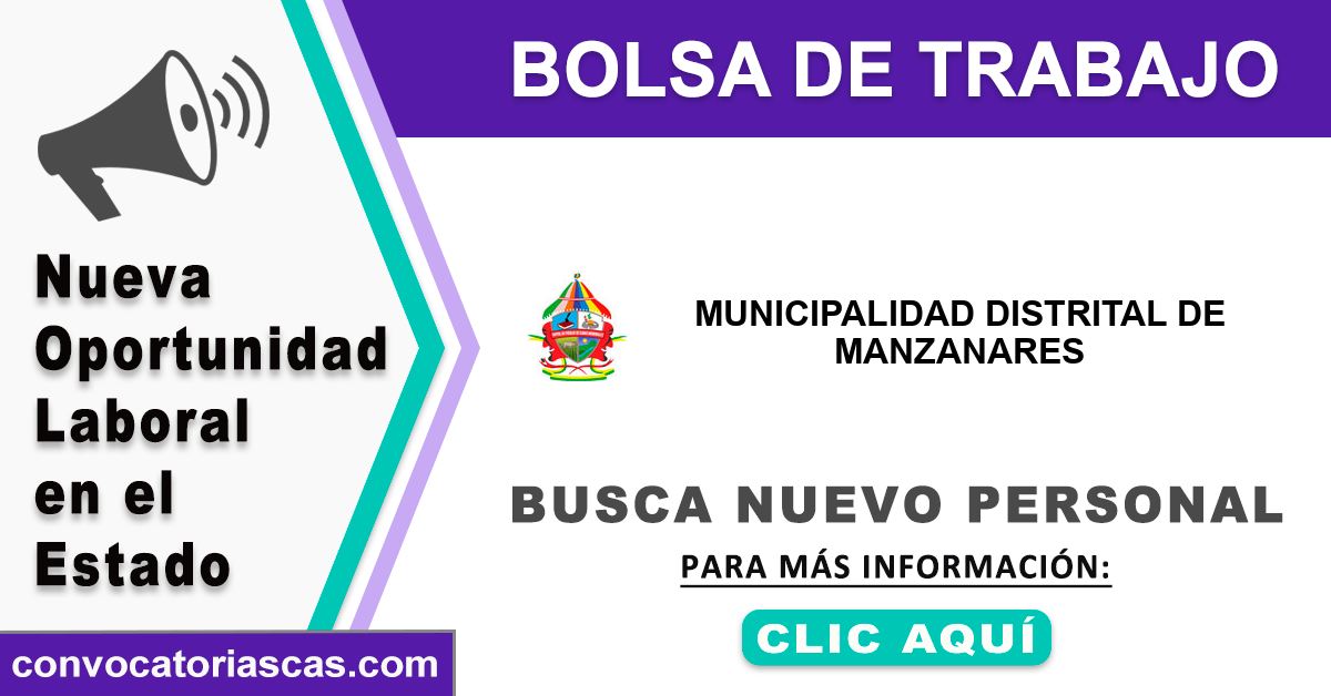 😀 Hay 1 ofertas de empleo para integrar nuevo personal a MUNICIPALIDAD DE MANZANARES mediante un proceso de selección CAS.